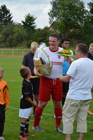 Am Wochenende gastierte mit dem TuS Fleestedt ein Altherrenteam aus Niedersachsen zum Trainingslager in Grimmen und so hatte man gleich einen passenden Gegner für Bötten`s Abschied parat.Die 1.Männermannschaft hatte die Ehre das Vorspiel für dieses Event zu bestreiten.Danach betraten die Gladiatoren die Arena.Einige noch sichtlich geschwächt von der 3.Halbzeit vom Vortag in Klevenow waren dankbar dafür das sie von einem Kinderteam des Grimmener SV an den Händen aufs Spielfeld geleitet wurden.Dann wurde unser Kapitän offiziell von den Verantwortlichen des GSV mit Blumen und Präsentkorb in den Ruhestand verabschiedet.Eine schöne Geste und Gänsehautatmosphäre in der Arena.Trotz der 11.376 Zuschauer konnte man eine Stecknadel fallen hören.Alle waren sichtlich bewegt.